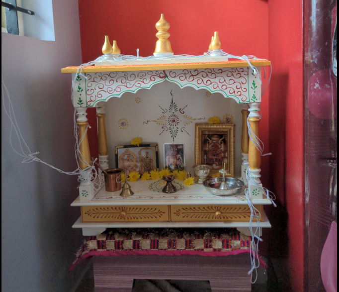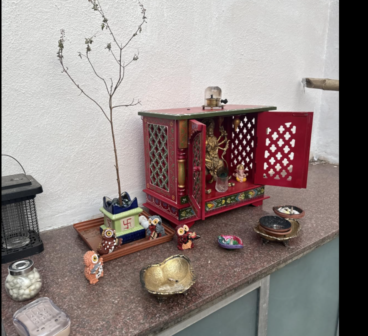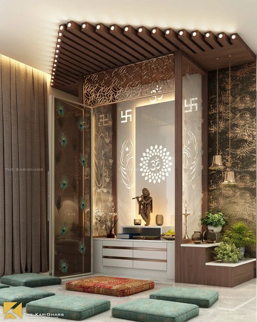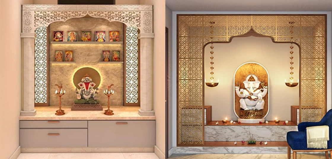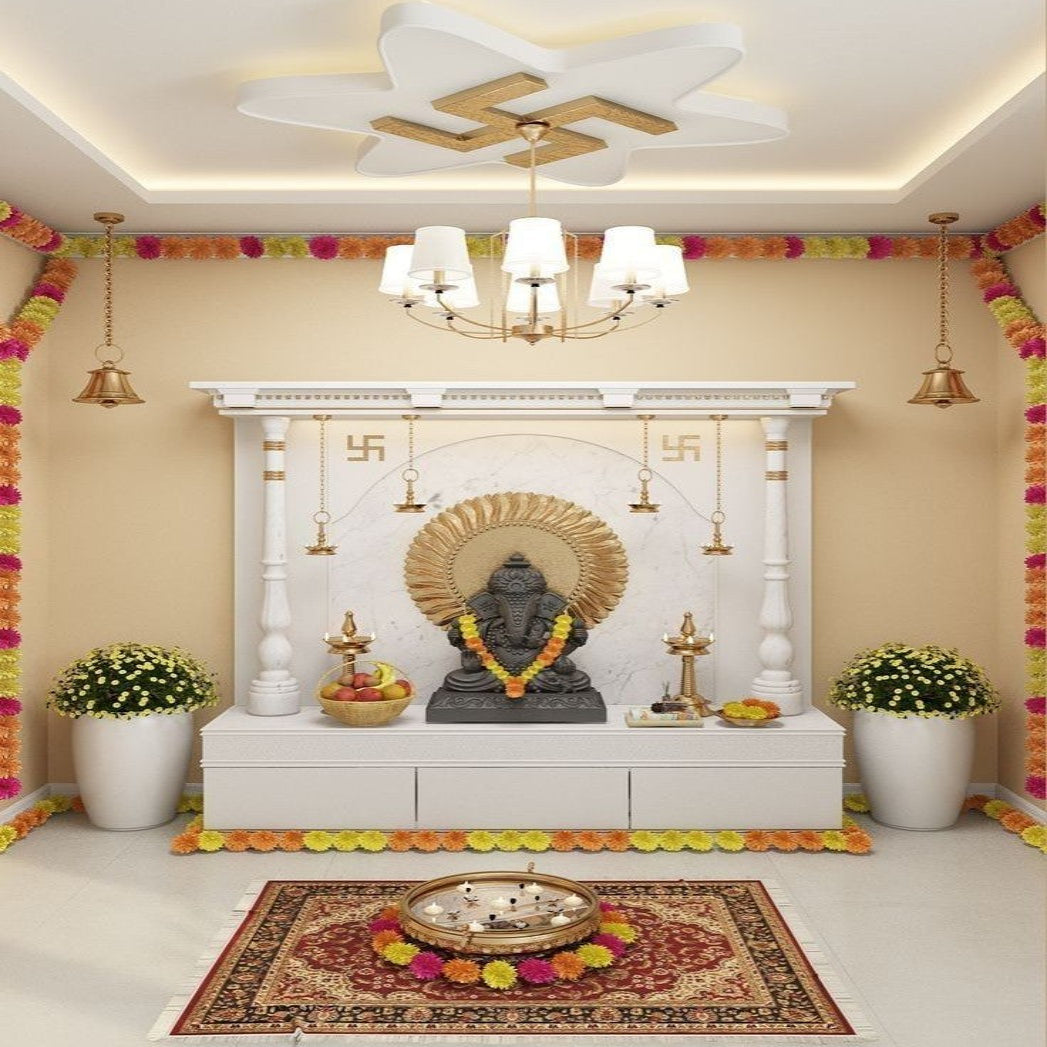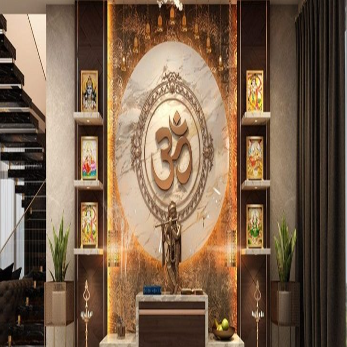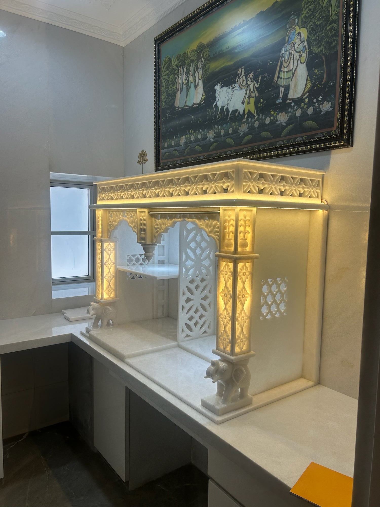 Integrated storage solutions, including built-in shelves and discreet compartments, keep your sacred items organized while preserving the mandir’s refined aesthetic.